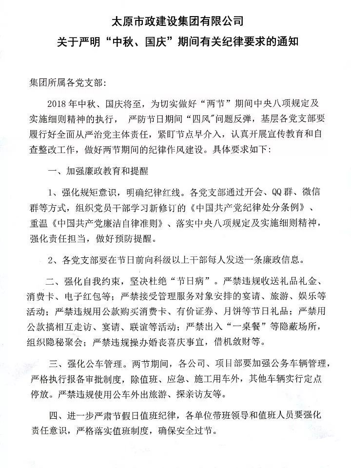 太原市政建設(shè)集團有限公司關(guān)于嚴明“中秋、國慶”期間有關(guān)紀律要求的通知