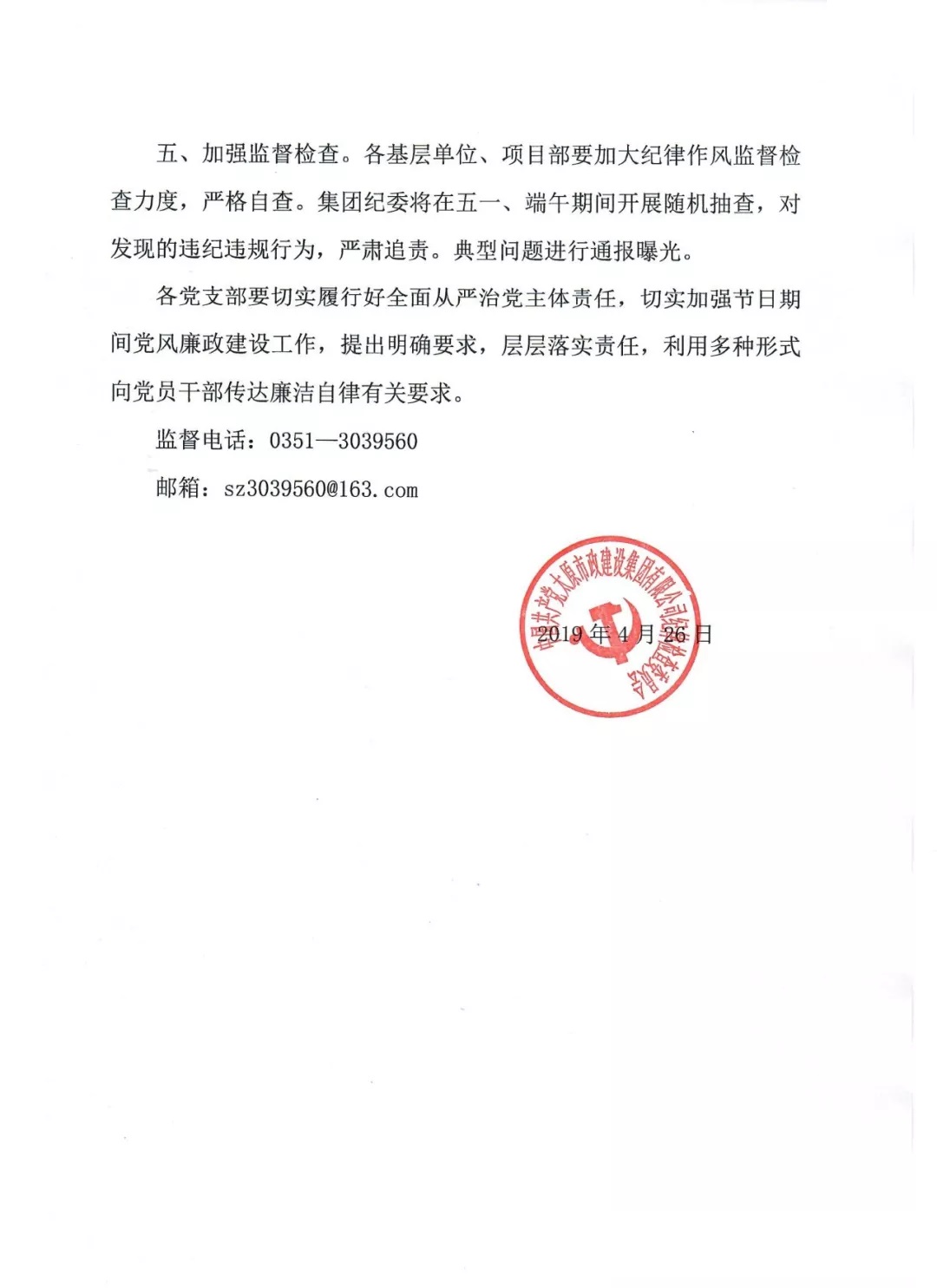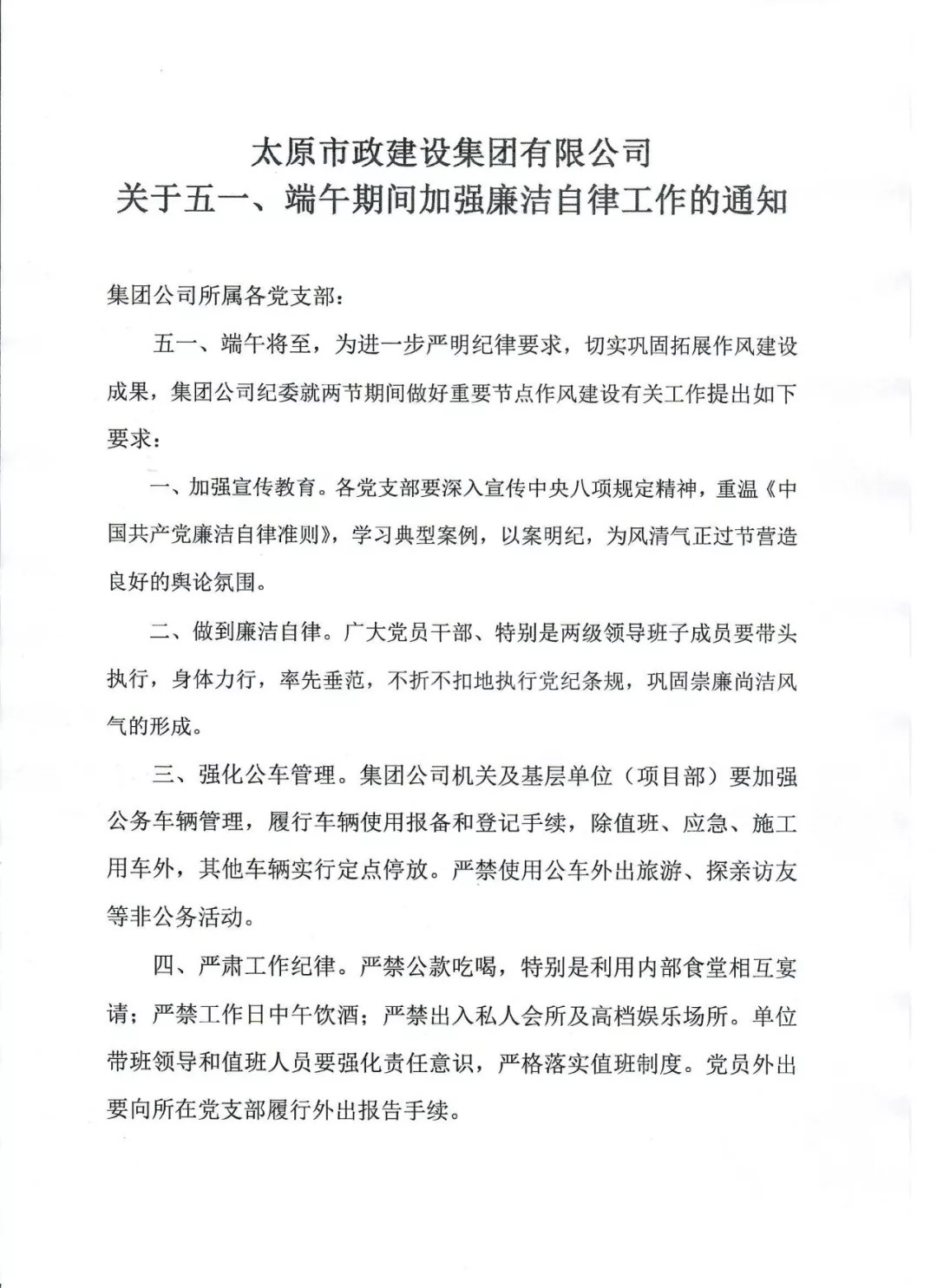 《太原市政建設(shè)集團有限公司關(guān)于五一、端午期間加強廉潔自律工作的通知》