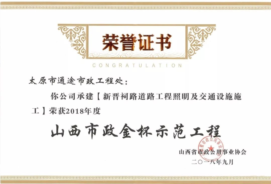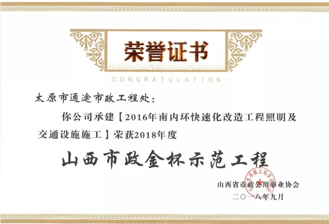 9月20日,通途市政工程處承建的南內(nèi)環(huán)快速化改造工程照明及交通設(shè)施施工、新晉祠路道路工程照明及交通設(shè)施施工榮獲山西省市政公用事業(yè)協(xié)會(huì)頒發(fā)的2018年度“山西市政金杯示范工程”榮譽(yù)稱(chēng)號(hào)。