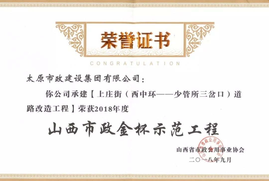 太原市政建設(shè)集團(tuán)有限公司多項(xiàng)工程喜獲山西省市政金杯示范工程榮譽(yù)稱號(hào)