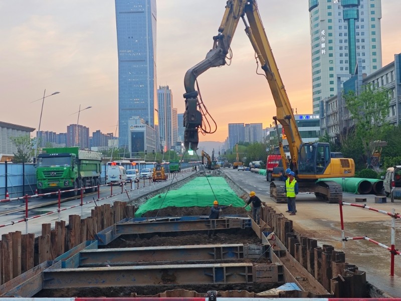 “追求精細(xì)極致,鑄就基坑支護的穩(wěn)固防線”。項目部將鋼板樁施打質(zhì)量視為確保基坑安全與質(zhì)量的關(guān)鍵環(huán)節(jié),嚴(yán)格執(zhí)行材料準(zhǔn)入制度,所有進(jìn)場鋼板樁均經(jīng)過材質(zhì)證明核查、尺寸精度測量和外觀質(zhì)量檢驗三重把關(guān),確保樁身無裂紋、無銹蝕等質(zhì)量缺陷,從源頭上杜絕不合格材料。施工中,施工人員采用全站儀進(jìn)行動態(tài)監(jiān)測,嚴(yán)格控制樁身垂直度偏差在規(guī)定范圍內(nèi),詳細(xì)記錄每根樁的打入深度、貫入度等關(guān)鍵參數(shù)。拔樁階段采用專用施工設(shè)備,按照“先支后拆、分段拔除”的原則有序進(jìn)行,拔樁后出現(xiàn)的孔隙立即灌砂,最大限度減少對周邊土體的擾動,實現(xiàn)平穩(wěn)施工與環(huán)境保護的和諧統(tǒng)一。