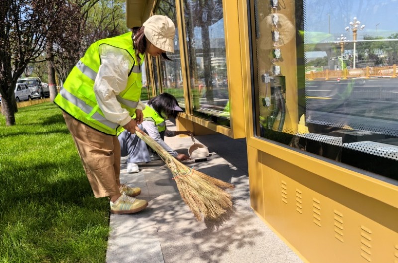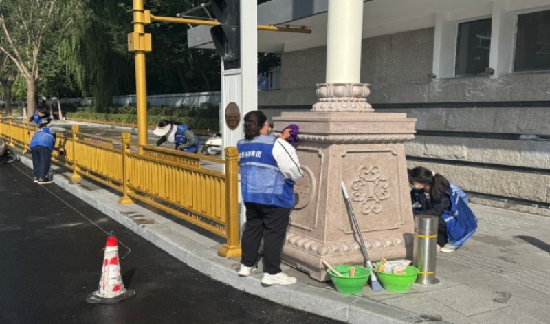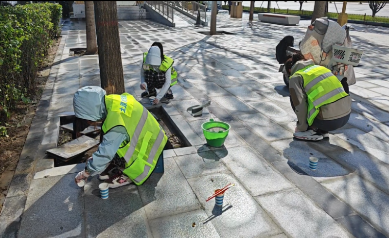 活動自9月4日起為期六天,覆蓋迎澤大街(西段)全線,重點圍繞附屬設(shè)施清潔與道路精細化維護展開?;顒又校碇y(tǒng)一藍色“太原市政集團”馬甲的志愿者們,手持長柄擦洗器、水桶、抹布、鏟刀、掃帚等工具,對道路兩側(cè)公交站臺、路燈基地、護欄、照明燈桿等設(shè)施進行系統(tǒng)清理與擦洗;同步推進地磚灌縫精細化維護作業(yè),通過專業(yè)操作,確保每一條裂縫都“嚴絲合縫”,有效提升路面耐用性與通行舒適度,以實際行動為市民出行安全與舒適保駕護航;同時,志愿者專門對道路沿線的石頭字景觀展開描金作業(yè),細刷蘸取金色涂料,一筆一畫精心描摹,成為主干道上一道兼具文化氣息與視覺美感的獨特風(fēng)景。