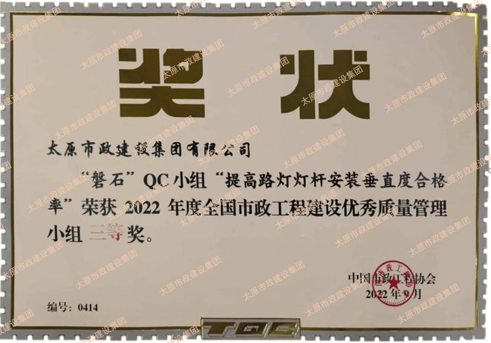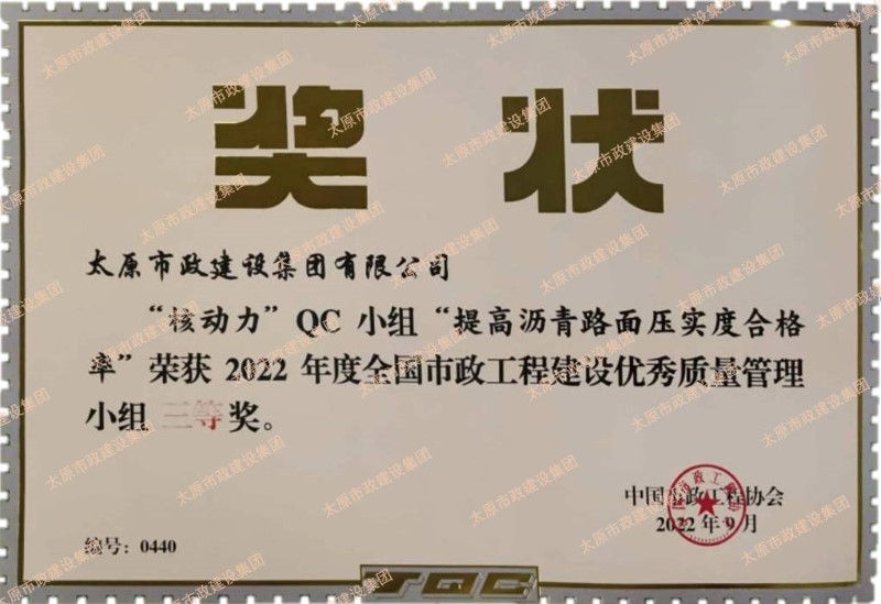 集團(tuán)公司申報(bào)的“磐石”QC小組“提高路燈燈桿安裝垂直度合格率”、“核動(dòng)力”QC小組“提高瀝青路面壓實(shí)度合格率”榮獲2022年度全國市政工程建設(shè)優(yōu)秀質(zhì)量管理小組三等獎(jiǎng)。