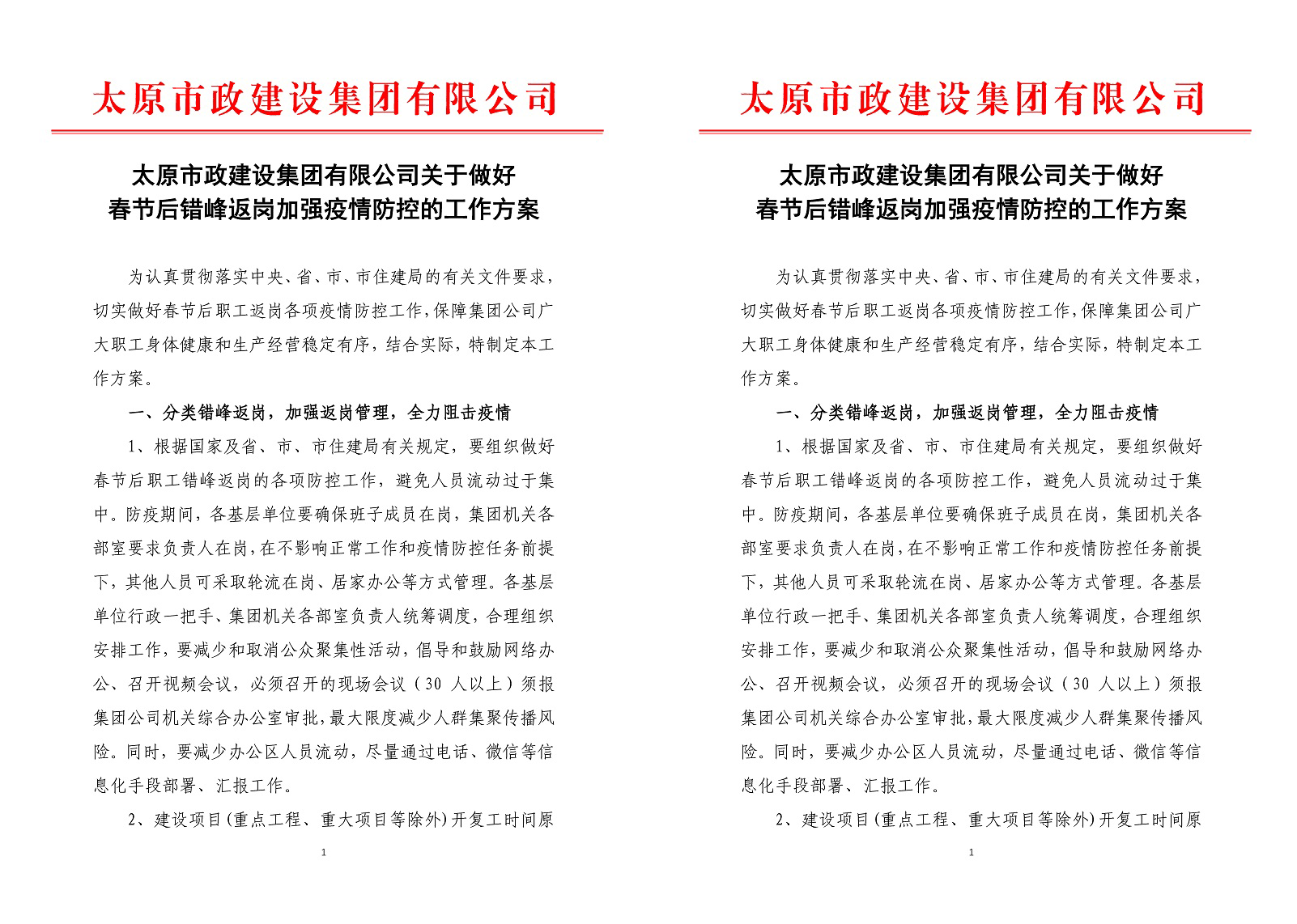 統(tǒng)一指揮,確保領(lǐng)導(dǎo)組織到位。為有效應(yīng)對(duì)新冠肺炎疫情,集團(tuán)公司迅速制定《太原市政建設(shè)集團(tuán)有限公司新型冠狀病毒防控應(yīng)急預(yù)案》,成立集團(tuán)公司新型冠狀病毒感染的肺炎疫情防控工作領(lǐng)導(dǎo)小組,以強(qiáng)有力的領(lǐng)導(dǎo)統(tǒng)籌協(xié)調(diào)推進(jìn)集團(tuán)公司疫情防范和處置工作。同時(shí),集團(tuán)公司制定《太原市政建設(shè)集團(tuán)有限公司關(guān)于做好春節(jié)后錯(cuò)峰返崗加強(qiáng)疫情防控的工作方案》,對(duì)職工復(fù)工前以及返程中個(gè)人防護(hù)、網(wǎng)上辦公等事項(xiàng)作出詳細(xì)安排和明確要求,保障集團(tuán)公司廣大職工身體健康和生產(chǎn)經(jīng)營穩(wěn)定有序。