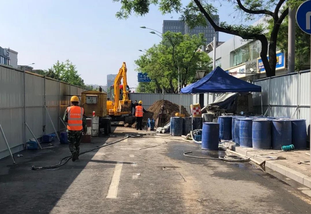 5月1日一早,三公司城南退水渠雨污分流及道路改造工程工地就響起了機械的轟鳴聲,挖掘機、注漿機、鏟車輪番上陣……項目部正在新建路段進行污水接入井的注漿和支護工作,由于該區(qū)域地下土質(zhì)為液陷土,透水性較強,易下陷,項目部經(jīng)過仔細研究后,決定采用二重管雙液注漿法對污水接入井進行注漿。相較于傳統(tǒng)注漿工法,二重管雙液注漿法將兩種漿液通過雙重管輸送至鉆頭出口處進行混合,通過調(diào)節(jié)漿液混合方式和注漿的方向性,控制注漿材料的凝結(jié)時間等,實現(xiàn)了注漿施工中對注漿方向、注漿量和注漿壓力的控制,使得加固范圍控制變得容易,漿液浪費少,施工可操作性更好,有效確保了工程質(zhì)量。