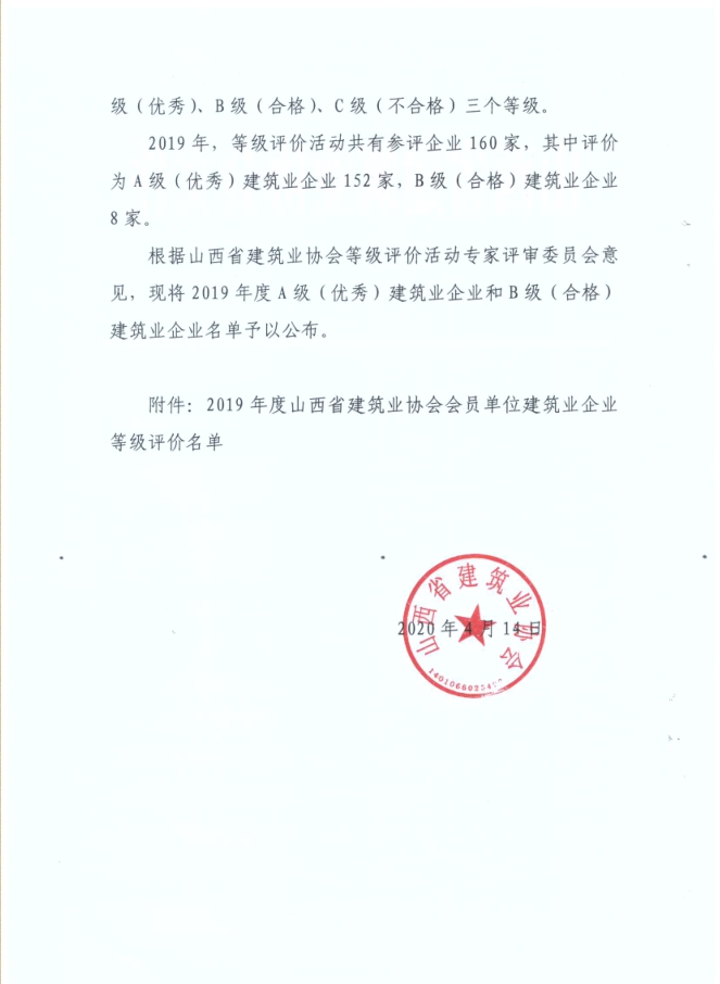 近日,山西省建筑業(yè)協(xié)會公布2019年度建筑業(yè)企業(yè)等級評價名單,集團(tuán)公司被評為2019年度山西省A級(優(yōu)秀)建筑業(yè)企業(yè)。