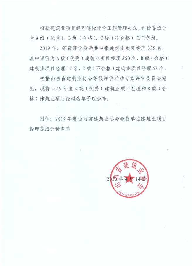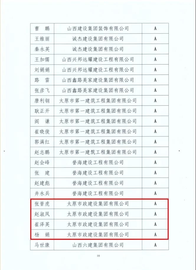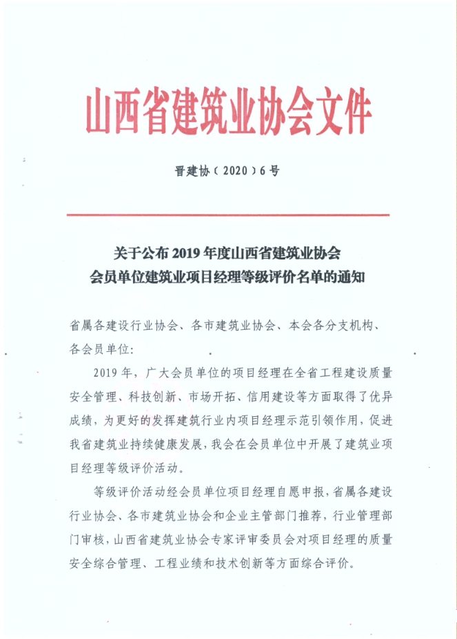 在“2019年度山西省建筑業(yè)協(xié)會會員單位建筑業(yè)項(xiàng)目經(jīng)理等級評價”評選結(jié)果中,集團(tuán)公司張晉虎、趙淑鳳、崔澤英、楊娟被評為2019年度山西省建筑業(yè)A級(優(yōu)秀)項(xiàng)目經(jīng)理。