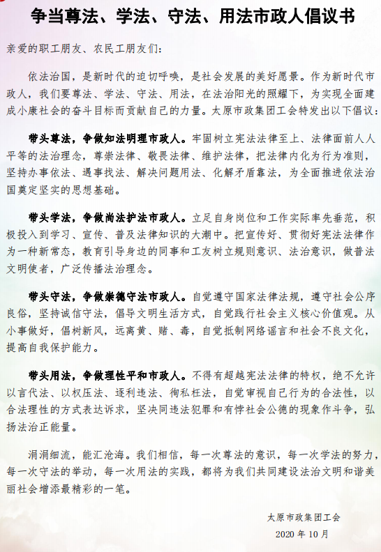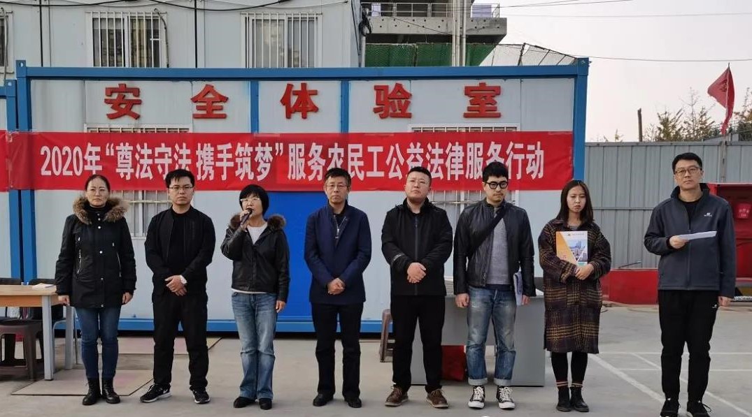 活動(dòng)中,律師事務(wù)所的5名律師現(xiàn)場(chǎng)為職工、農(nóng)民工進(jìn)行了法律宣傳和咨詢。集團(tuán)公司工會(huì)工作人員為大家發(fā)放了《爭(zhēng)當(dāng)尊法、學(xué)法、守法、用法市政人倡議書》、法律宣傳資料以及活動(dòng)紀(jì)念品。同時(shí),參加活動(dòng)的職工和農(nóng)民工在2020年“尊法守法 攜手筑夢(mèng)”服務(wù)農(nóng)民工法制宣傳行動(dòng)條幅上簽名。