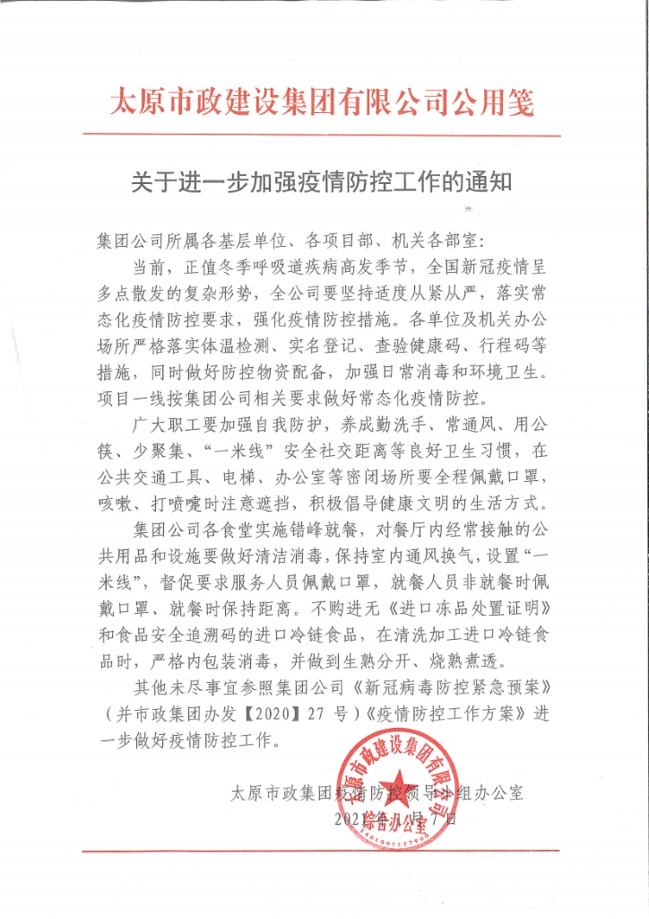 太原市政集團(tuán)關(guān)于進(jìn)一步加強(qiáng)疫情防控工作的通知