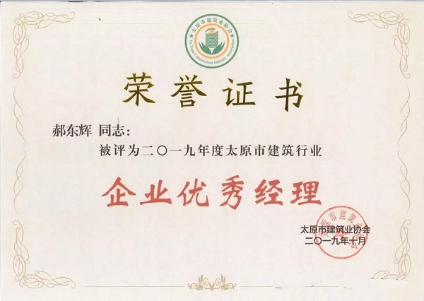 集團公司黨委書記、董事長郝東輝榮獲“2019年度太原市建筑行業(yè)企業(yè)優(yōu)秀經(jīng)理”榮譽稱號。